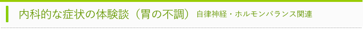 食後、2~3時間後に、胃の膨満感のため、えずいたり、胃が重くなるので、何をするのにもやる気の出ない事が多い状態でした。他に、目まいや首の痛みなどもありました。治療後、2日目から胃の膨満感はなくなり、目まいや、首の痛みなどもなくなりました。